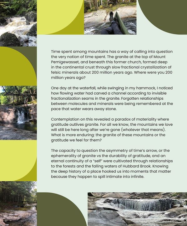 Installed at three locations in the forest and one on campus at Plymouth State, Field Marks (Hubbard Brook Experimental Forest) represent four of the ever-increasing number of sites within the forest for which we have developed a deep reverence.